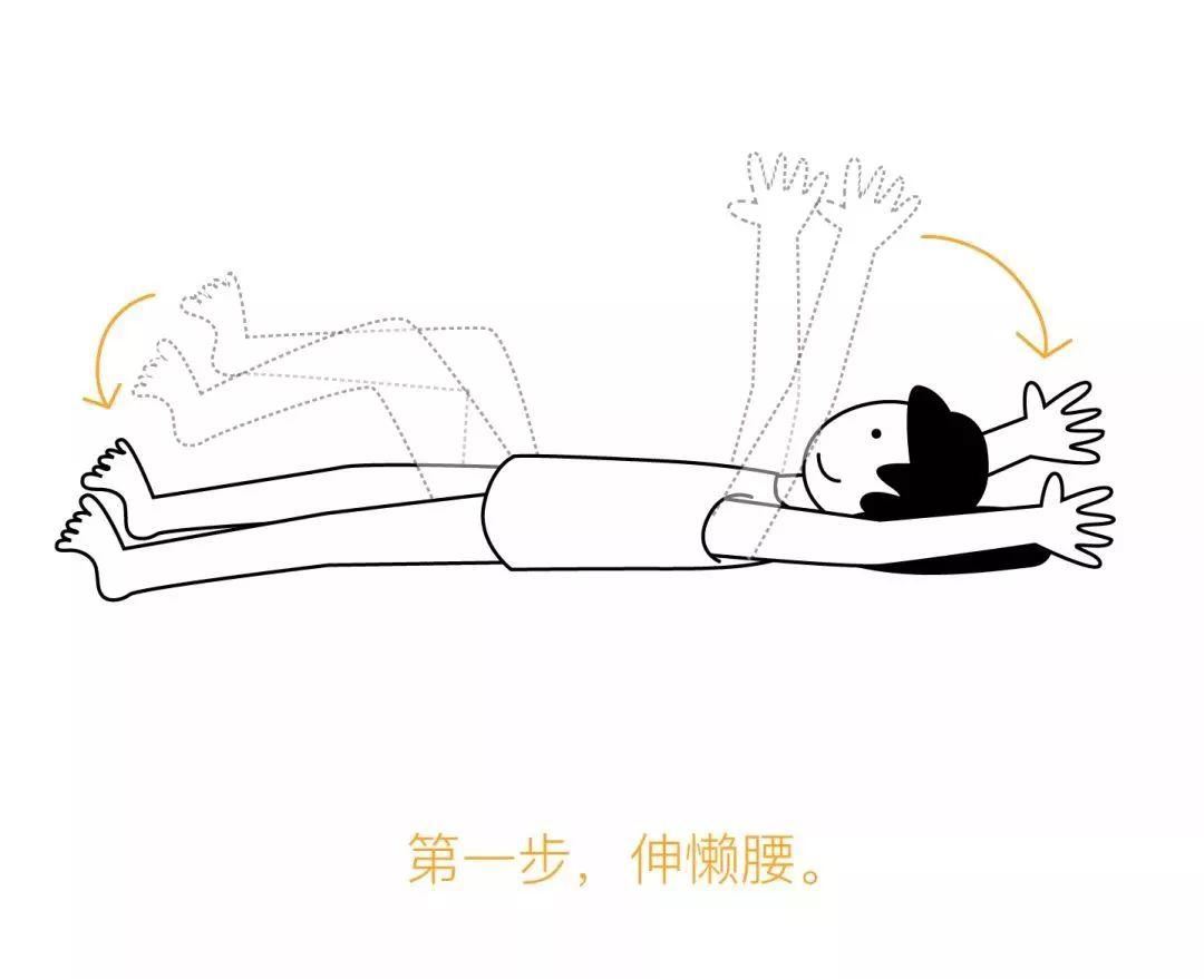 早上醒来别着急起床,先在床上伸懒腰,可以反握床边辅助,把筋拉开,三四下即可。