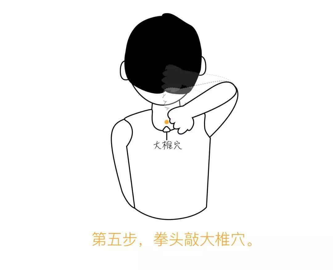 用拳头敲打背后的大椎穴——大概位于低头时颈后最突出的骨头下面。敲的时候力道可以适当重一点,感觉头有“嗡嗡”震动的感觉即可。