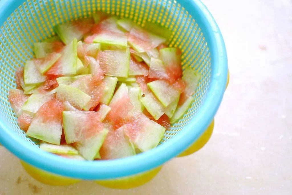 ② 将西瓜翠衣去掉外皮,切成细条,加少许食盐腌制,配以调料,可以做出一盘醒脾开胃的凉拌菜。
