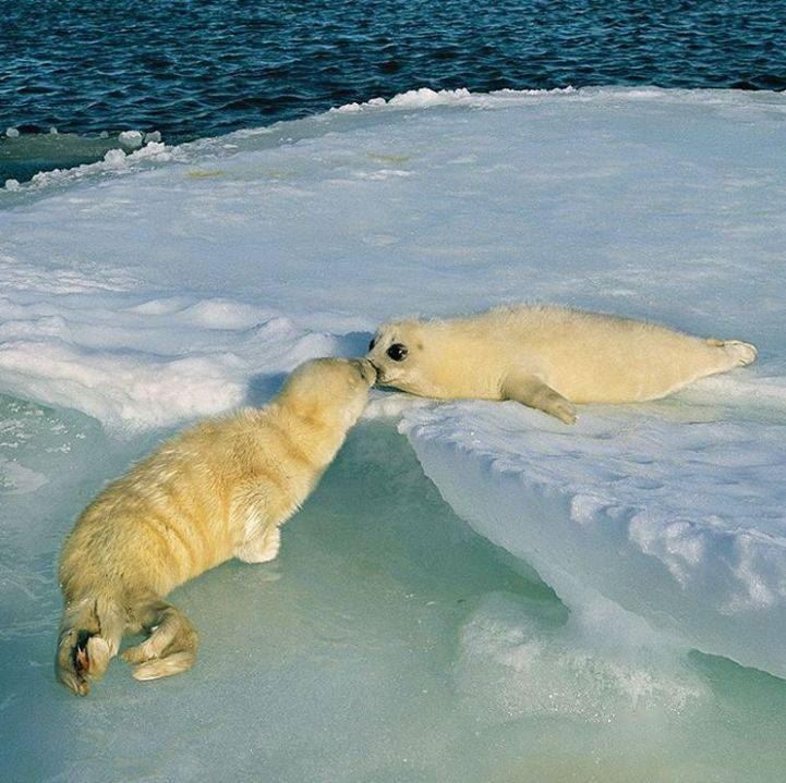 两只可爱的小海豹正在互相亲吻,满满的都是爱~