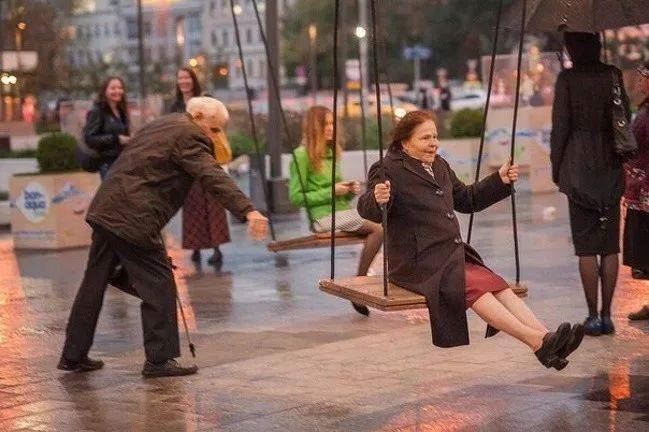 这位白发苍苍的老人正在为他的心上人推秋千,这就是爱情的模样吧!