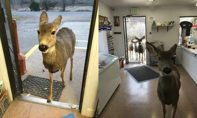 这只羚羊收到商店主人给它的巧克力和饼干后,过了一会,它带着全家人一起来了。