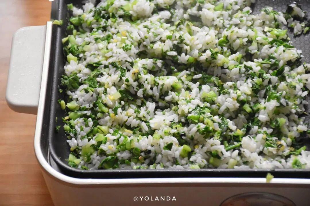 4. 锅烧热,放入芥菜碎,摊开来炒(中火);