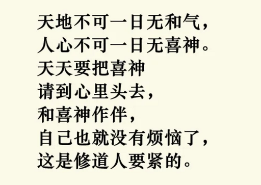 在《菜根谭》上有句话说:“光风霁月,草木欣欣;怒雨疾风,禽鸟凄凄,故天地不可一日无和气,人心不可一日无喜神。”