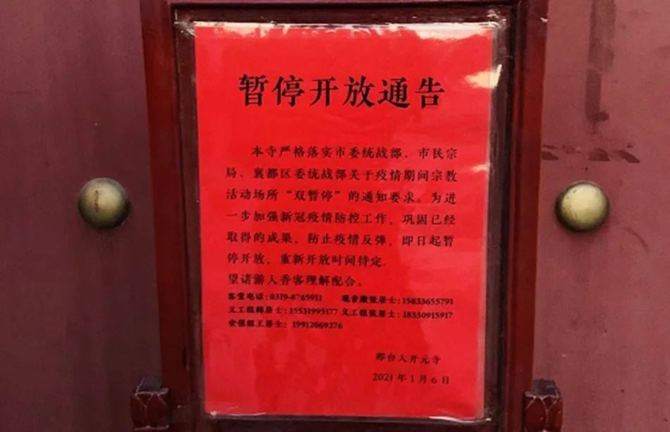 1月6日,接到上级主管部门通知后,邢台大开元寺立即执行暂停开放佛教活动场所、暂停一切聚集性佛事活动的“双暂停”规定,实行封闭管理,暂停常住人员外出参访参学,严禁非本场所人员进入,确保佛教领域防控工作不厌战、不麻痹、不放松。