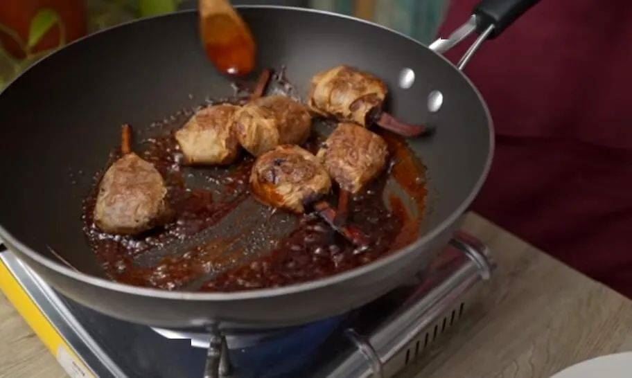 13.将炸好的棒棒腿放入酱汁中,让酱汁均匀包裹!
