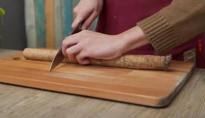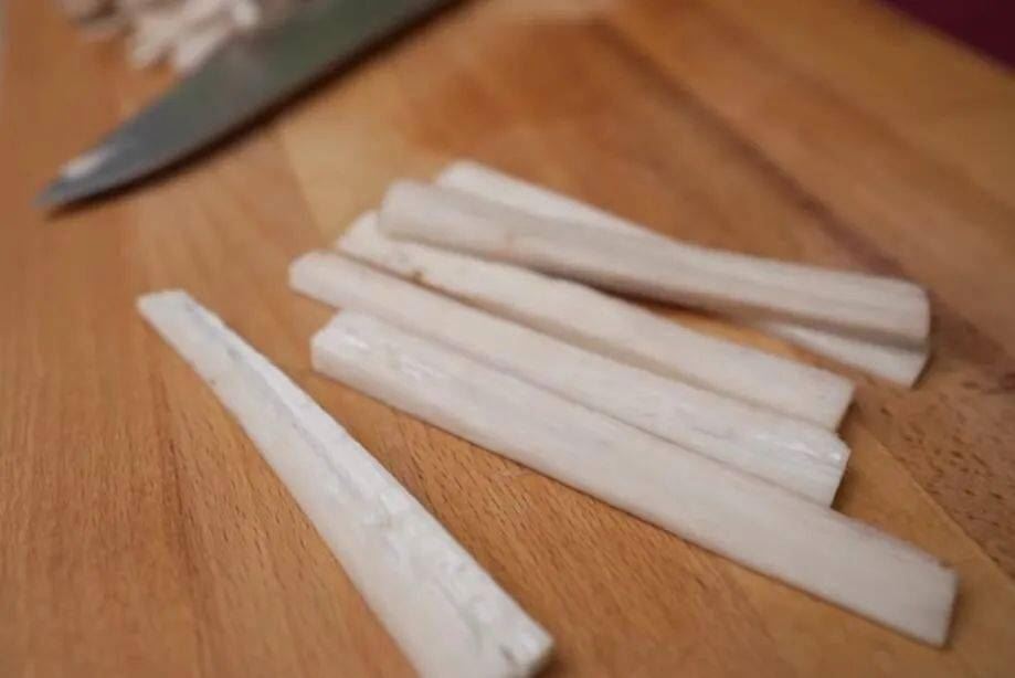2.将牛蒡去皮切成长约6cm的长条