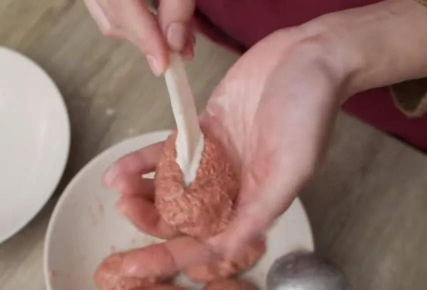 5.取一份植物肉揉成鸡腿的形状,将沾有面糊的牛蒡条放入植物肉中间