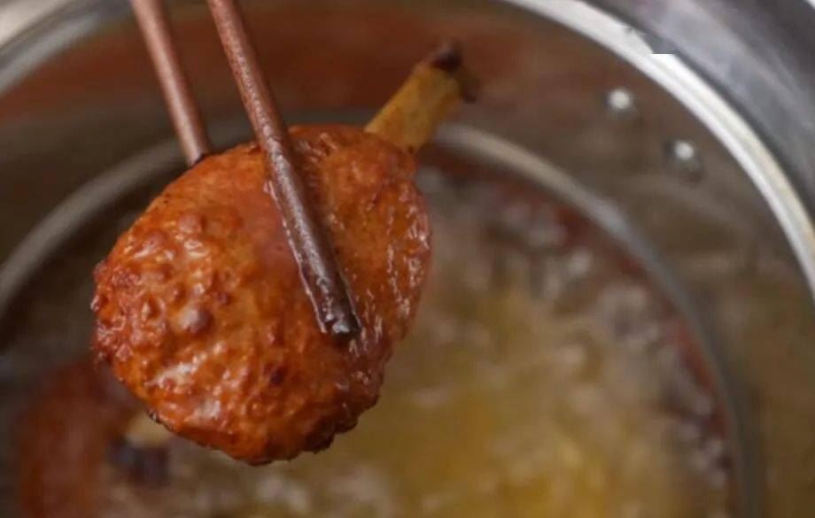 7.定型后的棒棒腿放入油锅炸制金黄色!