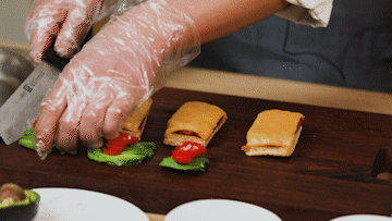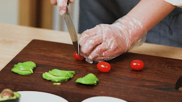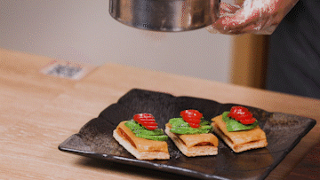 出炉以后,在芝士片上分别放牛油果切片和小番茄片,装盘。