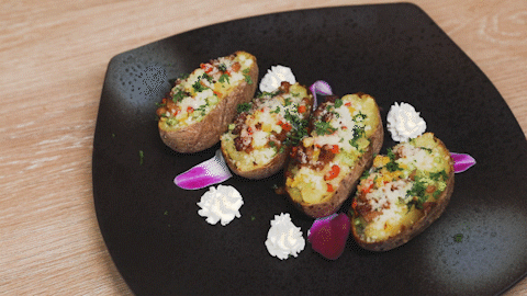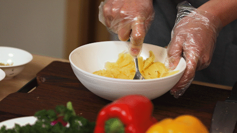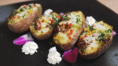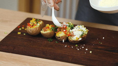 将炒好的新膳肉放在土豆壳中,把土豆泥盖住,然后依次将芹菜末、红甜椒、黄甜椒和荷兰芹均匀的洒在肉上方,最后撒上素起司粉。
