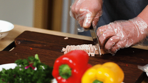 将之前冻入冰箱的新膳肉拿出,切成颗粒状,放入冰箱备用。
