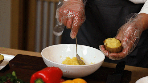 时间一到,将土豆从烤箱中取出,把每个土豆一分为二,用勺子小心挖出土豆泥,放入碗中,在碗中放少许盐巴、胡椒,并且搅拌均匀,用勺子将土豆泥弄散至无颗粒状。