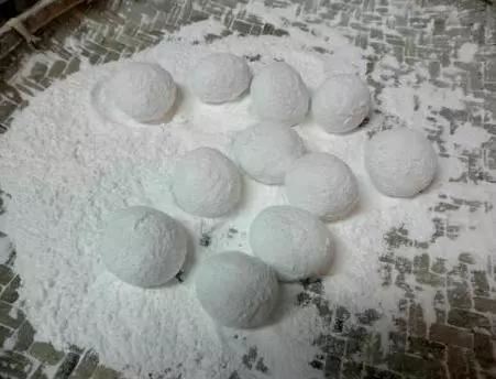5. 在沾满糯米粉的元宵表层均匀洒水,或用漏勺整体放在水中,沾湿快速捞出。