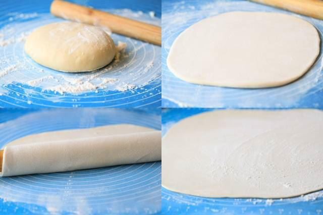 4. 撒少许面粉再卷起,再擀薄,反复三四次后擀成0.5cm的薄片;