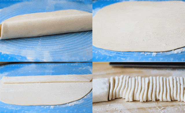 5.面片三等份对折,用刀切成细条,撒些许面粉抖散即可。