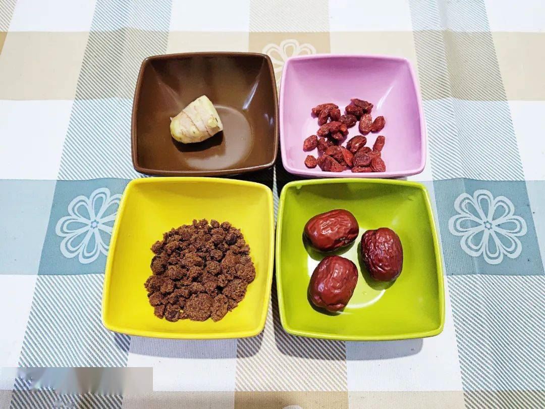 姜10克、枸杞10克、大红枣3个、红糖15克