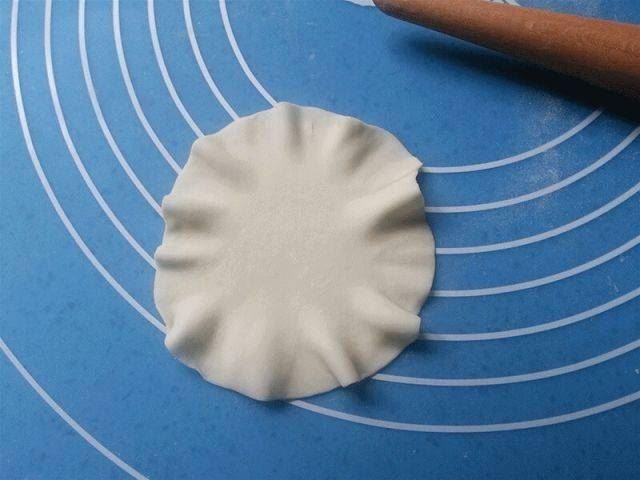 4、最后盖上一层饺子皮,用擀面杖擀薄;