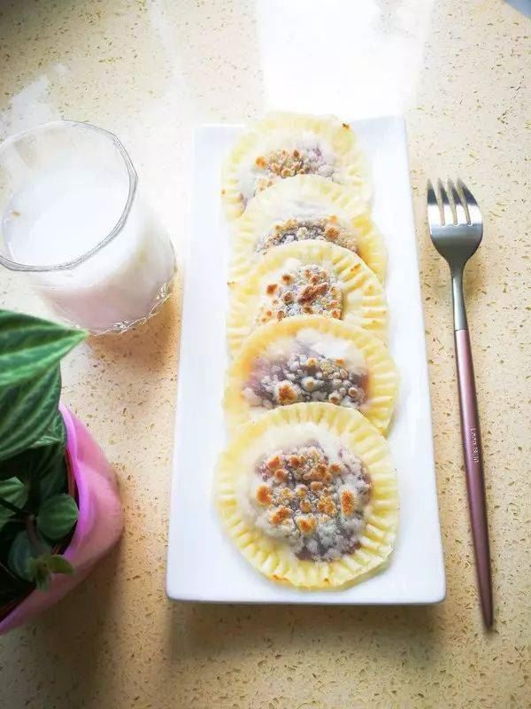 没有豆沙,放点白砂糖也行哦; 用叉子来粘合边缘也不错,更有造型感哈哈~
