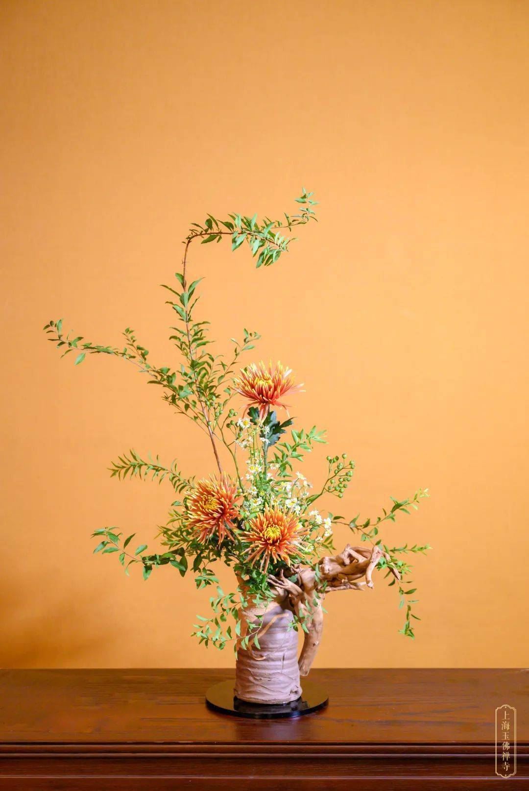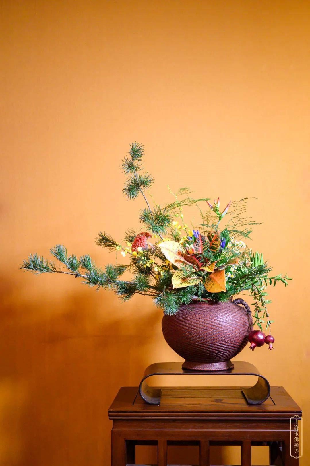 值此秋末冬初之际,本寺联合小原流上海东方支部以斑斓瑰丽的深秋花材插制作品,愿与大众共享这份秋日的静美。