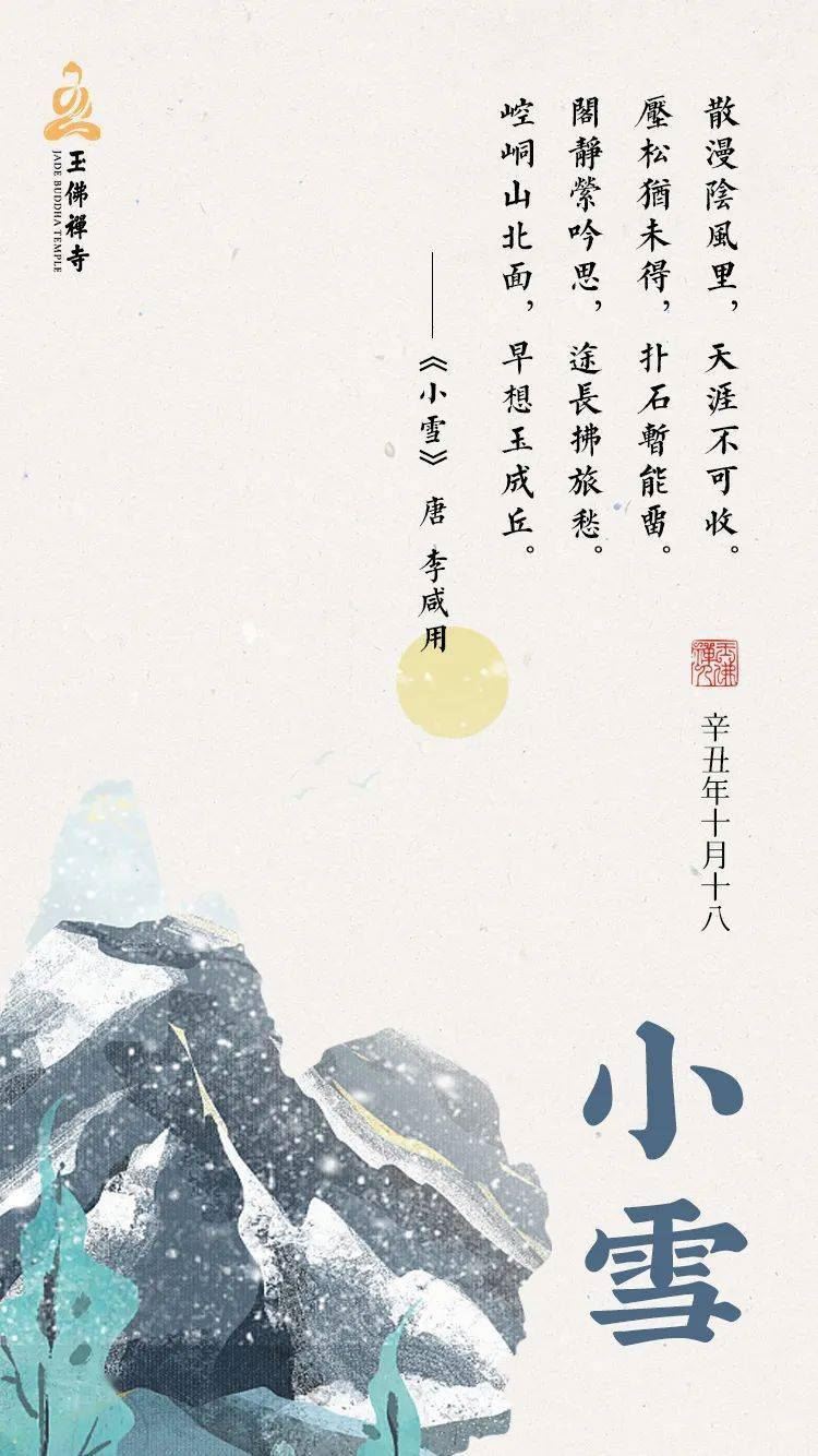 果然,前期暖冬似的江南,从小雪这一天开始突然大幅降温,空气变得冷冽,像一阵号角,吹开了寒冬的帘幕。正如唐朝李咸用的这首《小雪》,寒意已经散漫在小雪时节里,请记得添衣保暖,蓄以御冬;而遥想此时的北方,想必“崆侗北山面,早想玉成丘”。