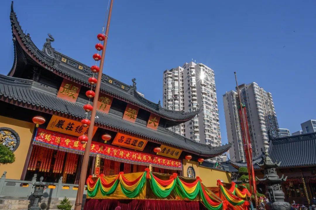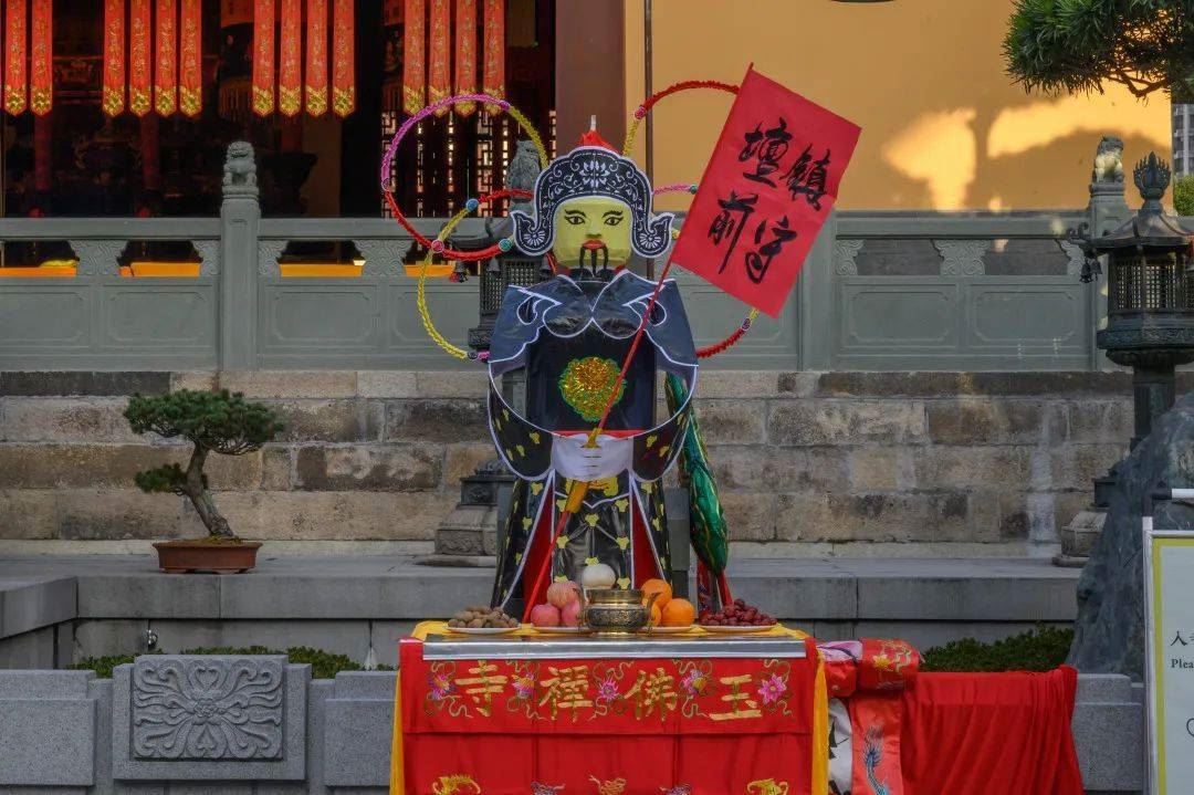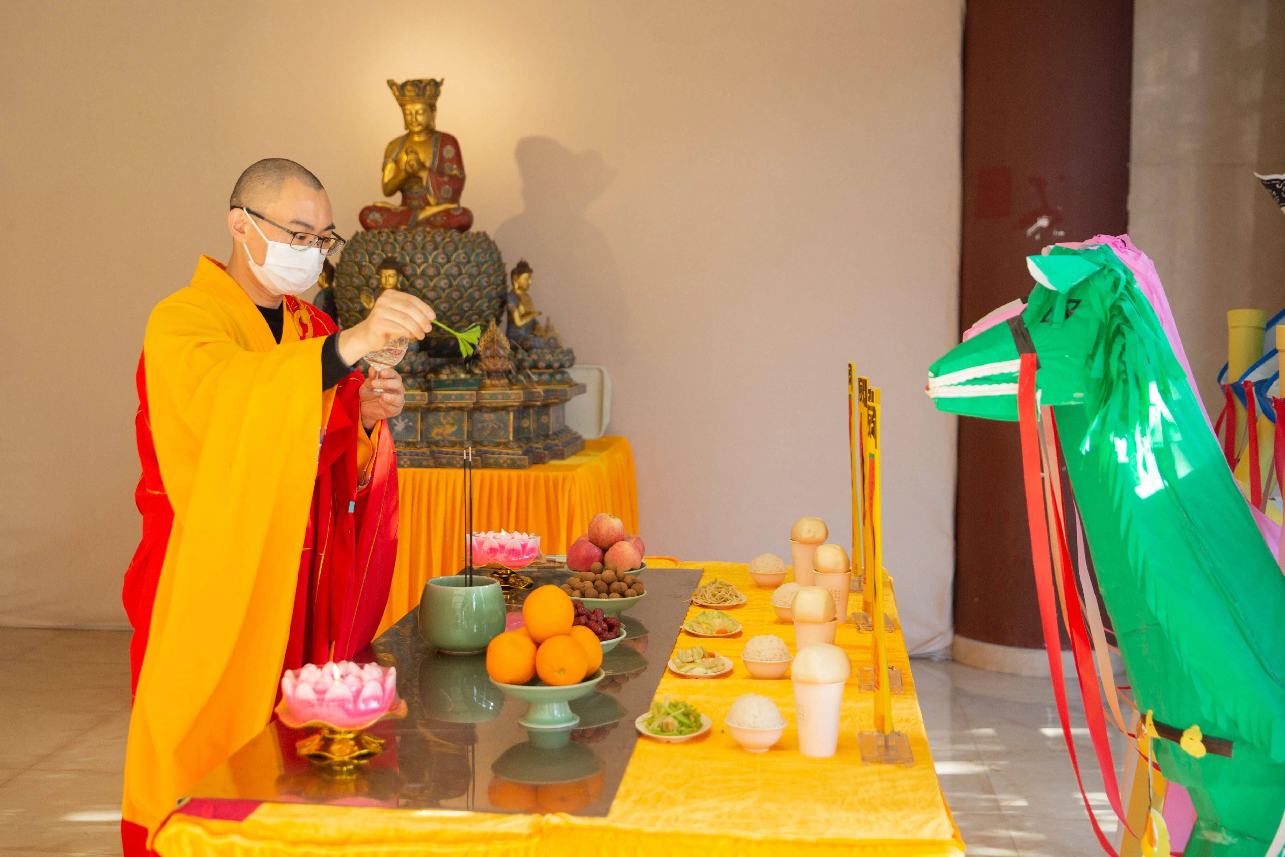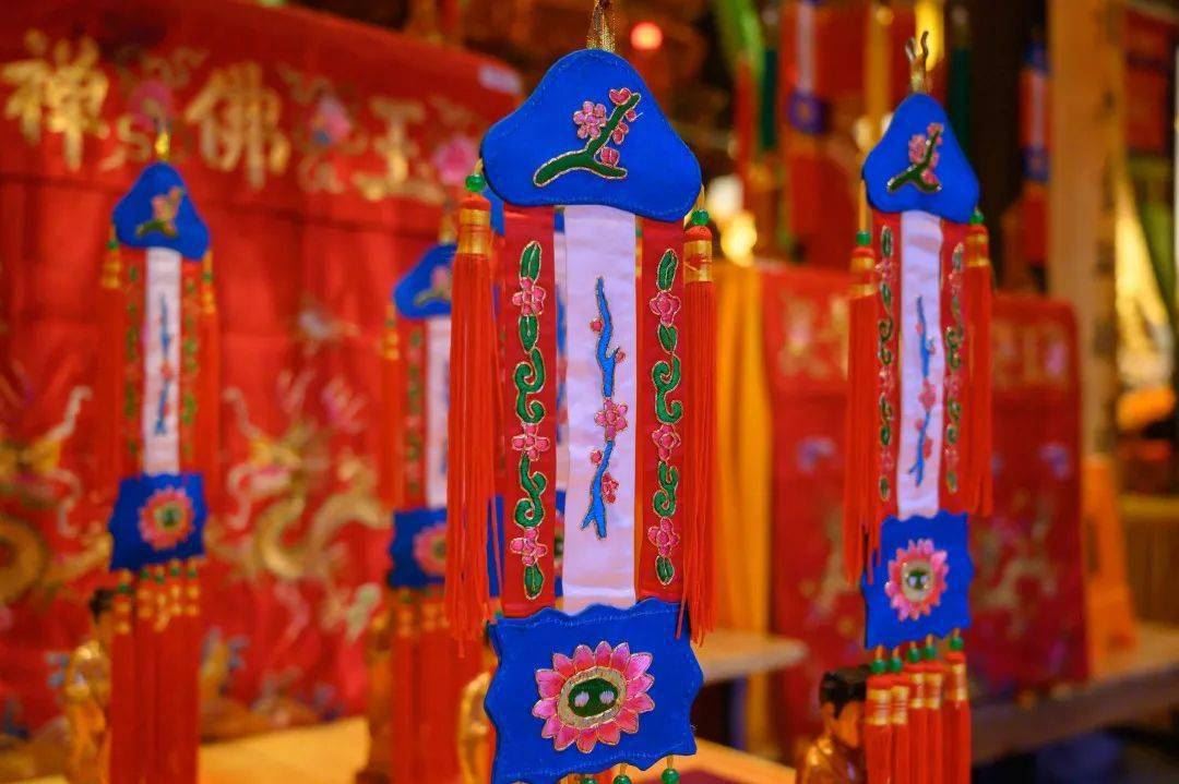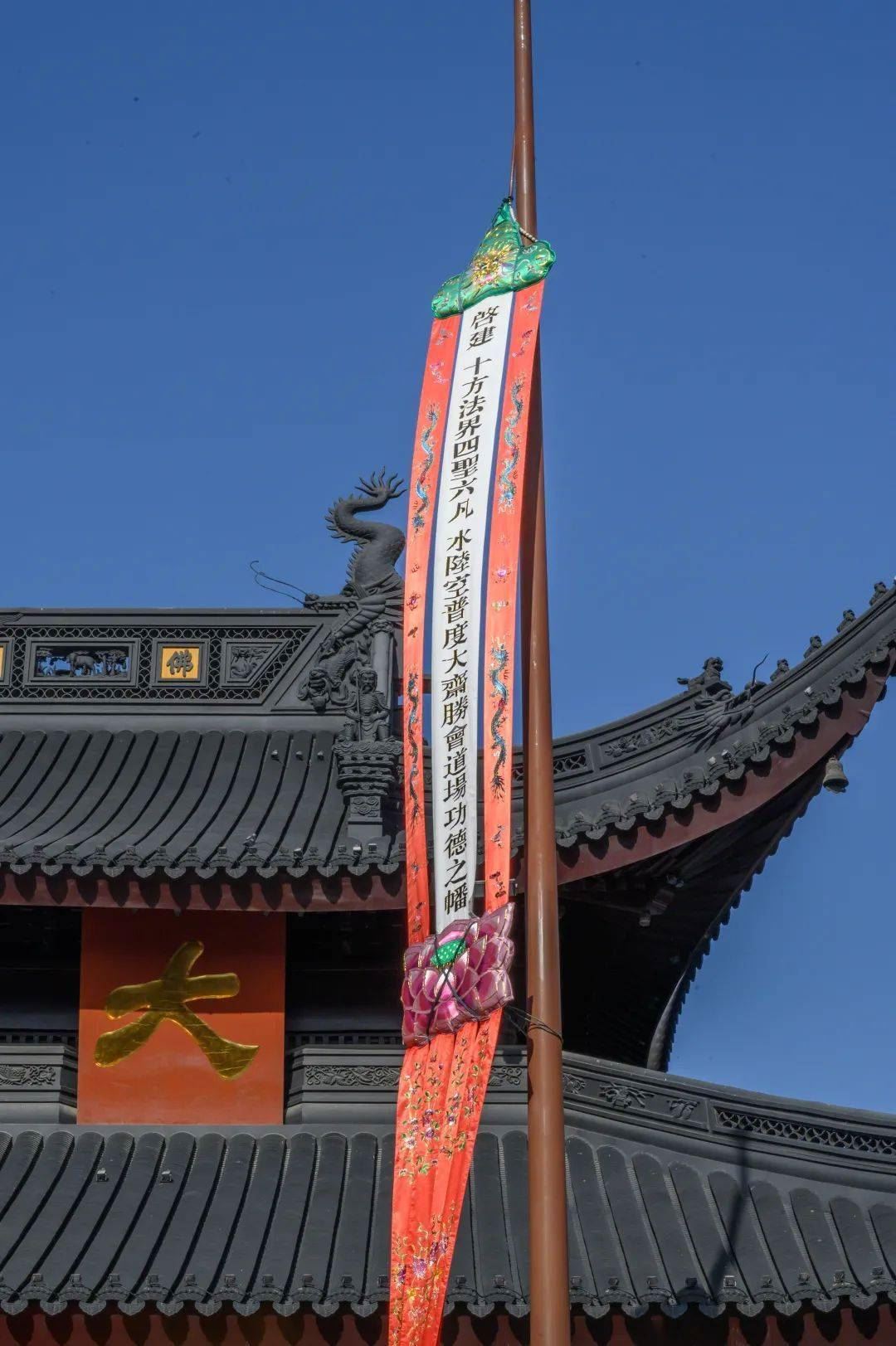 同时,在大雄宝殿前高立“启建十方法界四圣六凡水陆普度大斋胜会道场功德之幡”,旁挂九盏莲灯以供夜间照明,指引受邀的十方法界、六道众生前来赴会,普受法益,共沾慧雨。