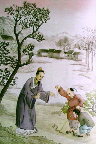 当他尚未成就仙道时,有一次外出遇见村童,捕捉一蛇,殴打戏弄,蛇身出血将死。孙真人怜悯蛇无辜遭受伤害,便向村童买回,用药敷治救活,然后放生于草泽中。 经过月余,孙真人在静坐间,见一位青衣少年前来邀请,真人跟随,到了世人称羡的水晶宫,见头戴合帽,身穿绛衣的龙王出来迎接,延请上座并说:“小儿前日出游,被人所伤,幸遇道人拯救,不胜感激。”即召青衣小官出来,再三拜谢,并殷勤设宴款待,留住三天,临行拿出奇珍异宝赠送,以表谢意。