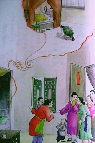 次日早上,渔夫送来一只大鳖,其妻劝他说:“昨夜梦见的黑衣人,恐怕就是这只大鳖,我们何不放生,做一件善事?”某见鳖心迷,没有允许,将鳖宰割烹煮,尽情啖食。