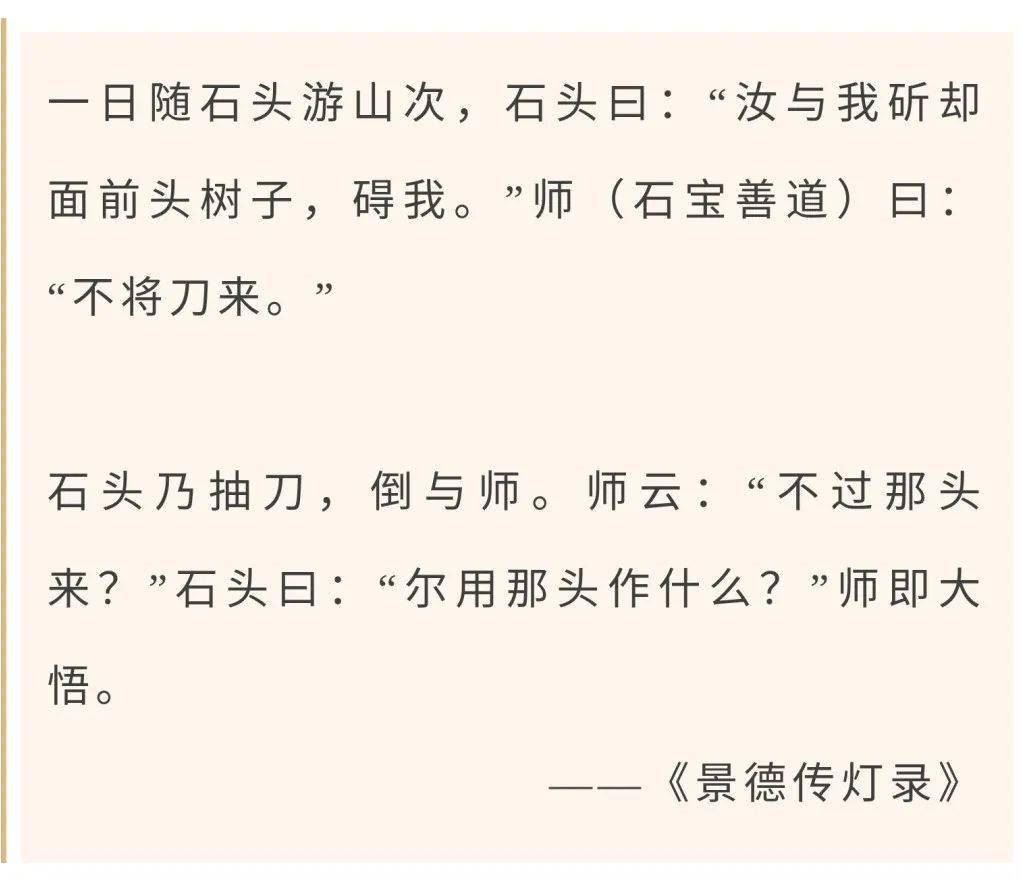 善道问:“怎么不把那头递给我?”石头说:“你用那头作什么?”善道立即大悟。原来,石头让善道砍掉挡路的树,不过是让他破除自性的迷障。善道不解石头用意。后来,石头将刀刃一头递给善道,意即要他不要执着这头或那头。这句话,使善道识心悟性。