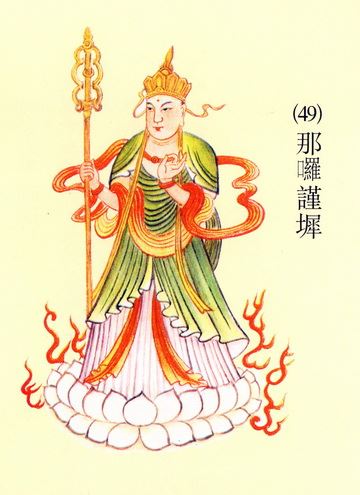 那啰谨墀:也是梵语。翻译过来的意思叫贤爱、贤首;言其为圣贤之首,在圣贤里头,他是头一个。又有一个意思叫善护、善顶;言其善能护念一切众生,善能度脱众生到最高的果位。