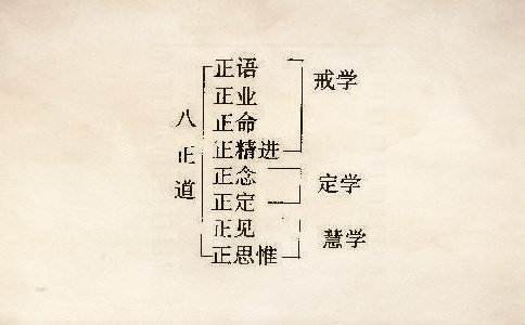 佛陀开示的八正道,已包含戒定慧三学,如正语、正业、正命,就是戒学;正念、正定,就是定学;定见、正思惟,就是慧学;而以正精进为策励力,使戒定慧三学得完成。八正道为圣者解脱的正轨,要求解脱,必须循着此八正道实践力行。至于在家佛徒,如能实践八正道,也可以净化自己,进而净化社会,使大众行正道,建立善的、安乐的、幸福的人生社会。