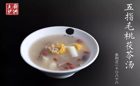 2、砂锅加水烧开,放入五指毛桃、土茯苓、薏米、眉豆、玉米、红枣,大火烧开改小火煲50分钟,放入山药、枸杞再煲10分钟,调入适量盐、蘑菇精即可。