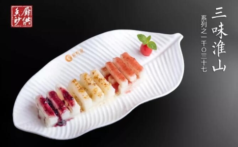 2、将淮山条放入蒸笼蒸5分钟取出,如图摆盘,淋上以上三种果酱即可。