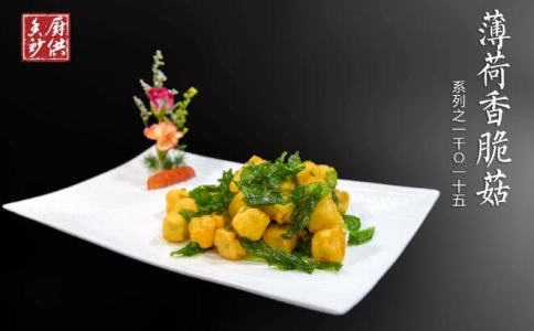 1、杏鲍菇洗净切粒,薄荷叶洗净待用,将脆炸粉加水调成面浆待用,杏鲍菇加入椒盐粉腌3分钟,挤干水分。