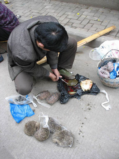 卖甲鱼的人,一手抓住被挑选好的甲鱼,手翻了过来,甲鱼的肚子向上,手脚正在不断地上下摆动挣扎。