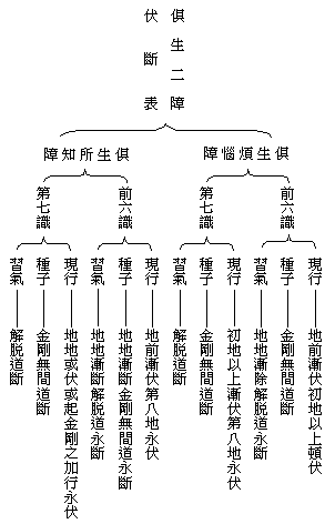俱生所知障种,亦即修道所断的所知障种,于十地中渐次断灭,金刚喻定现在前时才永断尽。习气则于解脱道中永断。此障的现行,地前加行位能渐制伏,乃至十地才永伏尽。八地以上,与前六识俱起者,不复现行;无漏观心及果相续,违彼障故。无漏观心即第六识中人法二空相本智,果即后得与灭尽定。八地以上,人空无漏恒时相续无有间断,法空无漏多分相续少分间断,故能令第六识中法空无漏不起的时候,唯人空无漏现前,对第七识法执来说,即为粗观,不能制伏细执,故第七识俱生的法执,仍能现行。若法空无漏智及彼所引起的后得智和灭尽定位,则能伏令不起。兹将俱生二障的伏断地位表示如表二:
