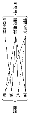 这三法印,是苦集灭道四谛变相的收摄,诸行无常,是苦谛;其生苦之因即集谛;涅槃寂静即灭谛;其证灭之因即道谛。无我则贯通四谛。如《大智度论》二十二卷说:佛说三种实法印,广说则四种,略说则一种。无常印是苦谛、集谛、道谛说。无我则一切法说。寂灭涅槃,即是灭谛。立表知(表四十八):
