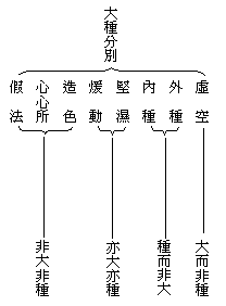 (一)四大种是:地界、水界、火界、风界。地界以坚劲为体性,水界以流湿为体性,火界以温热为体性,风界以轻动为体性。界是能持义,即地等能持自相及所造色,令其相似相续不绝。大有四义:一为所依大,与一切所造色为所依处。二体性宽广大,地等四种,遍在一切色上,无一物而非所造。三形相大,大地大由,为地大的增盛;大江大海,为水大的增盛;猛焰赤火,为火大的增盛;疾猛大风,为风大的增盛。四起用大,地界能持,水界能摄,火界能熟,风界能长,乃至成坏世界,作用广大。地等具有这四种大义,所以各得大的名称。种是因义、类义。地等四大,能为生、依、立、持、养五因,起造众色,是为因义。种类各别不同,是为类义。《大乘法苑义林章》大种造色章说:虚空虽大,不能为因;内种子等,虽能为因,体相非大;所余诸法,非大非种;由此地等,亦大亦种,故名大种。这是对于大种的四句分别,列(表二十)如上: