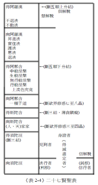 有学之三向三果,称为预流向乃至不还果。七种不还中,色界生之五种圣者称为中般乃至上流般,九无学加有学位之十八种,称为二十七贤圣,下表《表 2-4》为二十七贤圣之详细列表。