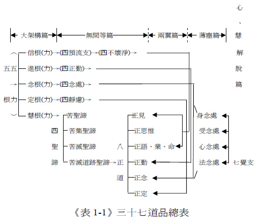 (五)心、慧解脱篇:此篇之内容为四圣谛、八正道与十二缘起之关系,四圣谛之苦、集二谛等同于十二缘起之生命流转之述说,而截断此一不断生死轮回之现状,则依灭、道二谛之八正道而成就心与慧之解脱。《表 1-1》为三十七道品各科品相对相关之图表。