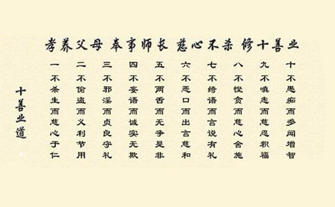 由五戒扩大,即十善业道,谓之天乘,能修十善到达上品的,来生可享受天福。只是五戒侧重在身的修为,而十善是兼明心的动念而已。因此可以说,开五戒第四的妄语为:不妄语,不两舌,不恶口,不绮语的四戒,合起来就是(一)不杀生,(二)不偷盗,(三)不邪淫,(四)不妄语,(五)不两舌,(六)不恶口,(七 )不绮语,(八)不贪,(九)不镇,(十)不痴,十善戒法,或称十善业道。现在将十善业道略述于下: