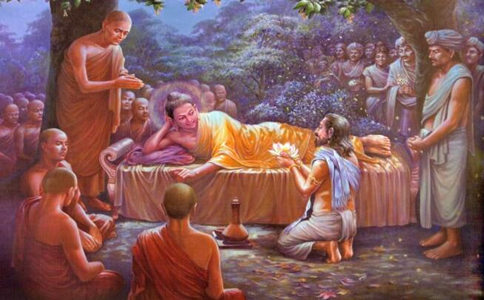 佛陀在阿难陀铺好的僧伽梨 SANGHATI (3)上,右肋卧下时,已经疲倦不堪。这时一位外道须跋陀罗 SUBHADDRA 来求见,佛陀又抖擞精神向他说法,他就成为最后度化的弟子。随侍佛陀的阿难陀等见佛病势沉重,十分难过,佛对阿难陀等说:「别难过,信任自己,紧握真理中求解脱。」阿难陀三次请佛住世 (4),佛陀回答:「万法自性仍归于灭,人人有生必有死,我的肉体怎能永存呢?我这段生命,必须循着自然法性 (5) 而归于寂灭。」阿难陀和罗侯罗等听了,不禁流泪!于是众弟子公推阿难陀请问佛陀四个问题: