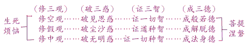 宇宙万有,悉含有空假中三种谛理,已详前课,今所言者,系对此三谛,加以观察,即空观假观中观,是为三观,此三观皆具于一心之中,名一心三观。作此三观,能破三惑之暗,而成三智。其关系是:修空观,破见思惑,证一切智。一切智是声闻缘觉,知一切法总相之智,总相即是空相,证此智即成如实觉了的般若德。修假观,破尘沙惑,证道种智,道种智是菩萨知一切道法差别相之智,证此智即成离缚自在的解脱德。修中观,破无明惑,证一切种智,一切种智,是佛通达诸法总相别相,化道断惑之智,合一切智及道种智二者,故名一切种智,证此智即成常住不灭的法身德。此三德本人人所固有,无始以来,为三惑所蔽,不能显现,今若一修观破惑,即证本有,而成菩提涅槃之道矣。列表于下: